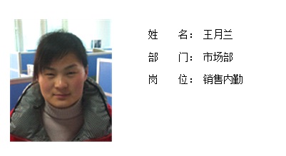 王月蘭同志至進入公司以來一直任勞任怨,工作作風(fēng)認(rèn)真踏實,協(xié)調(diào)公司各個部門配合市場銷售人員的工作,是市場部最可靠的后備保障。