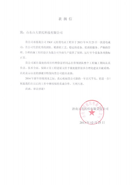 2013年9月23日濟(jì)南平陰35kV元紡變電站一次送電成功,并至今持續(xù)正常穩(wěn)定的運(yùn)行。為此濟(jì)南元首紡織有限責(zé)任公司特別給我們發(fā)來(lái)表?yè)P(yáng)信,對(duì)我們的技術(shù)和服務(wù)提出贊揚(yáng),對(duì)現(xiàn)場(chǎng)施工期間表現(xiàn)優(yōu)異的項(xiàng)目經(jīng)理徐富祥提出點(diǎn)名表?yè)P(yáng)。