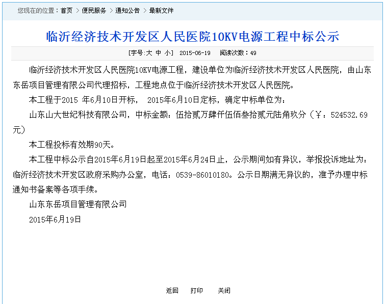 公司臨沂辦事處于2015年6月19日經過參加公開招標中標臨沂市經開區(qū)人民醫(yī)院10kv電源工程。 該工程項目經理張榮澤,工期60天,6月30日前完成簽約。