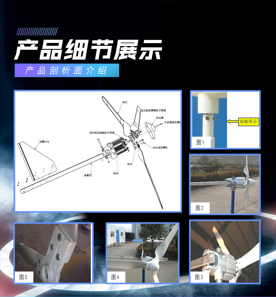 8、采用自動(dòng)對(duì)風(fēng)裝置,使風(fēng)力發(fā)電機(jī)自動(dòng)調(diào)整對(duì)準(zhǔn)迎風(fēng)方向,兼顧調(diào)向靈敏性和穩(wěn)定性,風(fēng)力較大情況下發(fā)電機(jī)尾翼斜置限速保護(hù)風(fēng)機(jī)不受損。